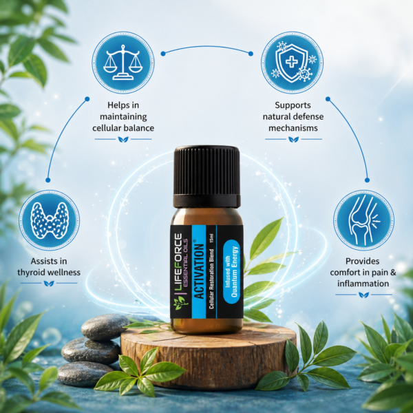 Activation is a 100% natural, premium-grade blend of essential oils infused with quantum energy, specifically designed to reduce oxidative stress and inflammation. This powerful formulation supports healthy cellular function and metabolism while protecting the body and cells from damage caused by oxidative stress and inflammation.