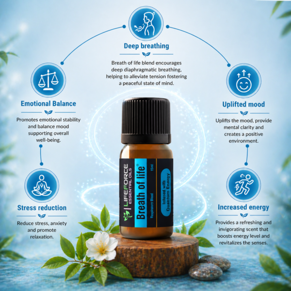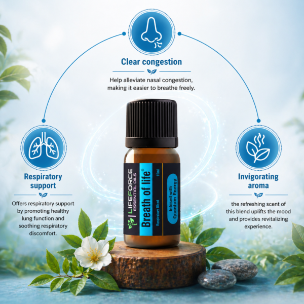 Breath of Life is a premium essential oil blend infused with quantum energy and carefully formulated to support healthy respiratory function. This powerful blend combines eucalyptus, peppermint, lemon, and tea tree essential oils, creating a potent formula to clear airways and promote deep, restorative breathing.
