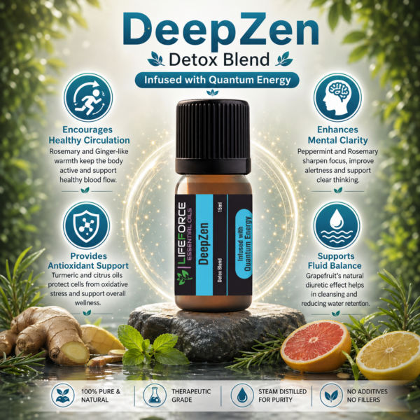 DeepZen is a premium 6-oil synergy designed to awaken the body’s natural cleansing power. With the freshness of Lemon and Grapefruit, the digestive comfort of Peppermint, the circulation support of Rosemary, and the ancient wisdom of Holy Basil and Turmeric, this blend is infused with Quantum energy to restore balance, vitality, and inner harmony. Just a drop every morning can become your daily ritual for clarity, energy, and holistic wellness.