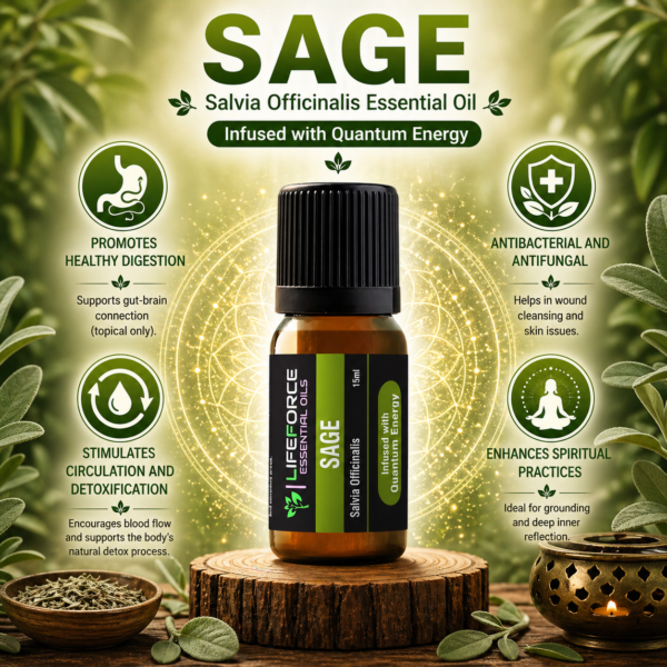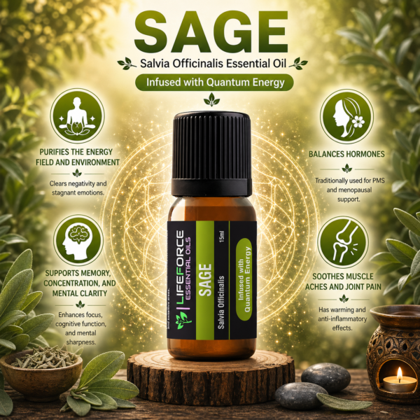 Known as the “Oil of Wisdom,” Sage essential oil has been used for centuries by healers, shamans, and spiritual practitioners for its cleansing, protective, and mentally clarifying properties. Infused with Quantum energy, this powerful oil promotes clarity of thought, energetic purification, hormonal balance, and emotional release. Whether used for spiritual practices or physical wellness, Sage is a revered ally for deep inner and outer transformation.