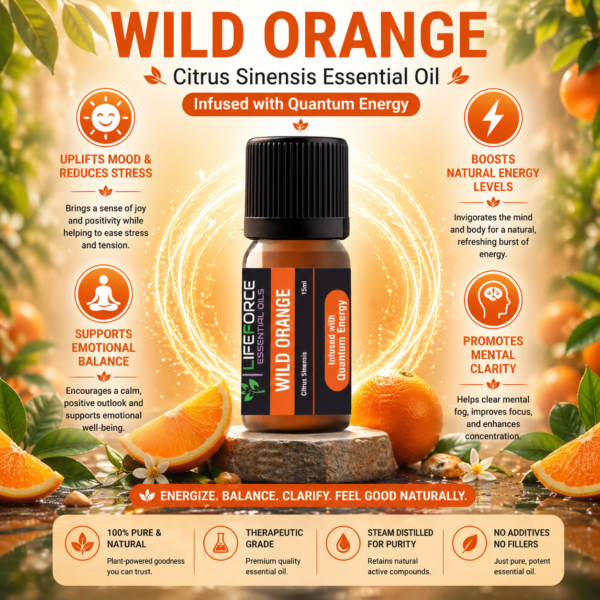 Wild Orange Essential Oil, infused with Quantum energy, is known for its refreshing aroma and uplifting properties. It harmonizes mind and body while activating natural life force energy. A true source of vitality, it brings brightness to your daily routine — both energetically and emotionally
