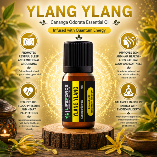 Known as the “Oil of the Heart”, Ylang Ylang carries a sweet, floral, exotic aroma that nurtures emotional well-being and enhances sensual balance. Infused with Quantum energy, it harmonizes the nervous system, opens the heart chakra, and subtly awakens the senses. Traditionally used to balance hormones and support intimacy, it is especially helpful for men dealing with emotional stress, low energy, or reduced libido — offering calm strength and emotional openness.